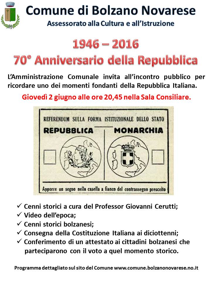 Tutti i cittadini sono invitati il 2 giugno, alle ore 20.45, in Sala Consiliare, per ricordare uno dei momenti fondanti della Repubblica Italiana.