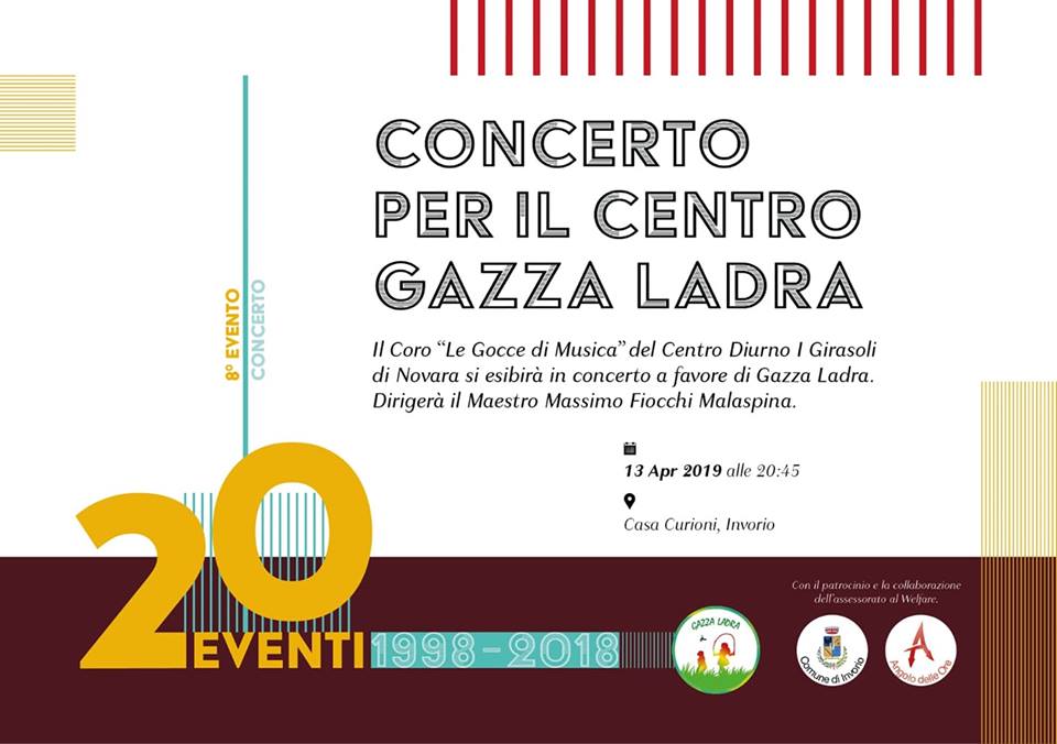 L'Assessore alle Politiche Sociali invita tutta la cittadinanza a partecipare sabato 13 aprile 2019 al Concerto organizzato e promosso a sostegno del Centro Gazza Ladra in collaborazione con l'Associazione Culturale l'Angolo delle Ore.