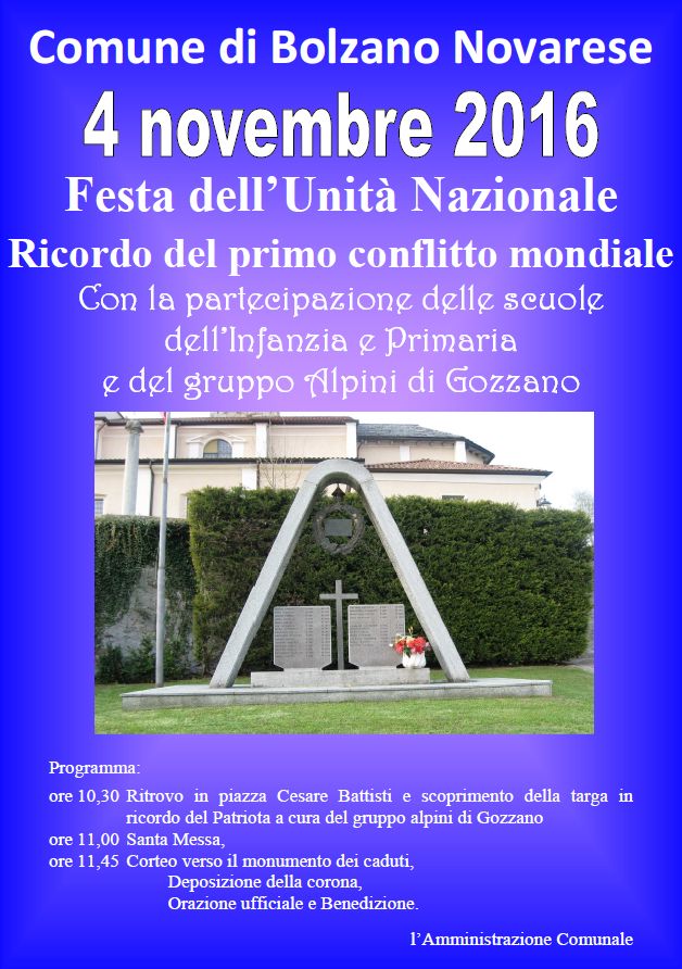 In occasione della Festa dell’Unità Nazionale del ricordo del primo conflitto mondiale, l'Amministrazione Comunale ha organizzato una commemorazione con la la partecipazione delle scuole dell’Infanzia e Primaria e del gruppo Alpini di Gozzano.