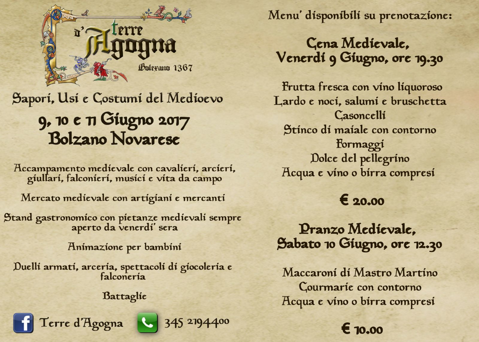 Pubblichiamo il menù della cena medievale di venerdì 9 giugno e del pranzo medievale di sabato 10 giugno 2017, nell'ambito della manifestazione Terre d'Agogna.