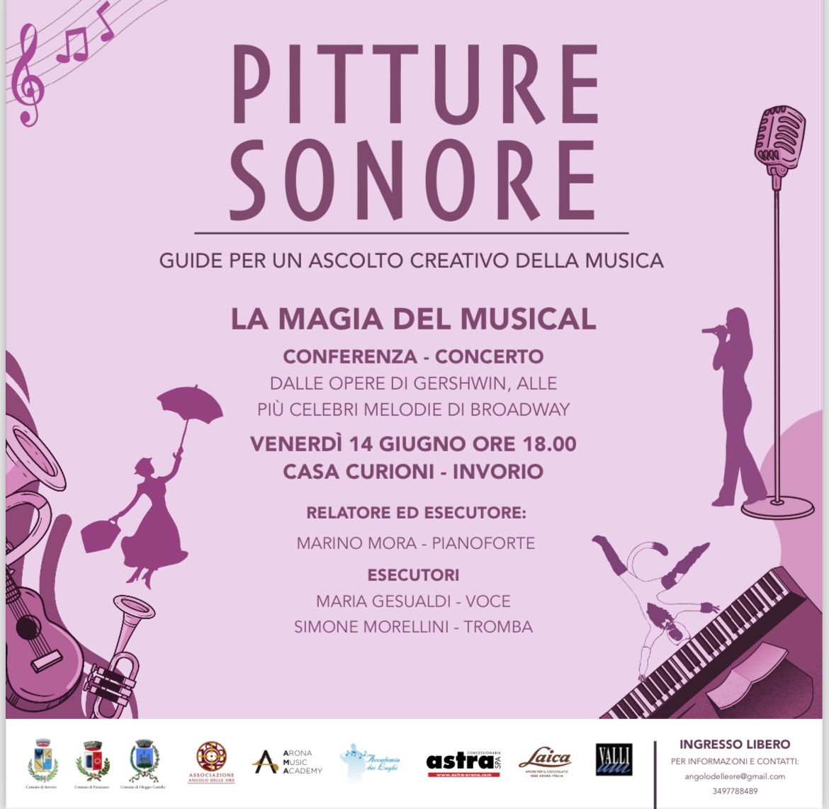 Dopo il successo delle precedenti serate, tutte col "tutto esaurito", Pitture Sonore prosegue la sua corsa di Conferenze Concerto alla scoperta delle Bellezze del Musical, con Arona Music Academy, Accademia dei Laghi, e la compartecipazione straordinaria in liaison dei Comuni di Invorio, Paruzzaro, Oleggio Castello -e benemeriti sponsor come Astra Fiat Arona, Mollificio Valli, Laica Arona!