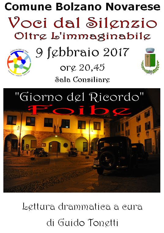 In occasione del Giorno del Ricordo, l'Amministrazione Comunale invita i cittadini ad assistere a una lettura drammatica a cura di Guido Tonetti, a memoria dei massacri delle Foibe.