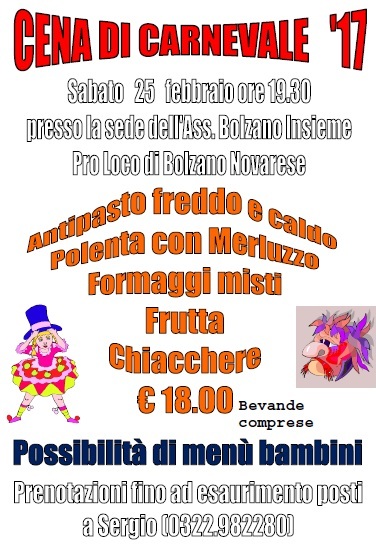 La cena si terrà sabato 25 febbraio alle 19.30 presso la sede dell'Associazione Bolzano Insieme - Pro Loco di Bolzano Novarese.