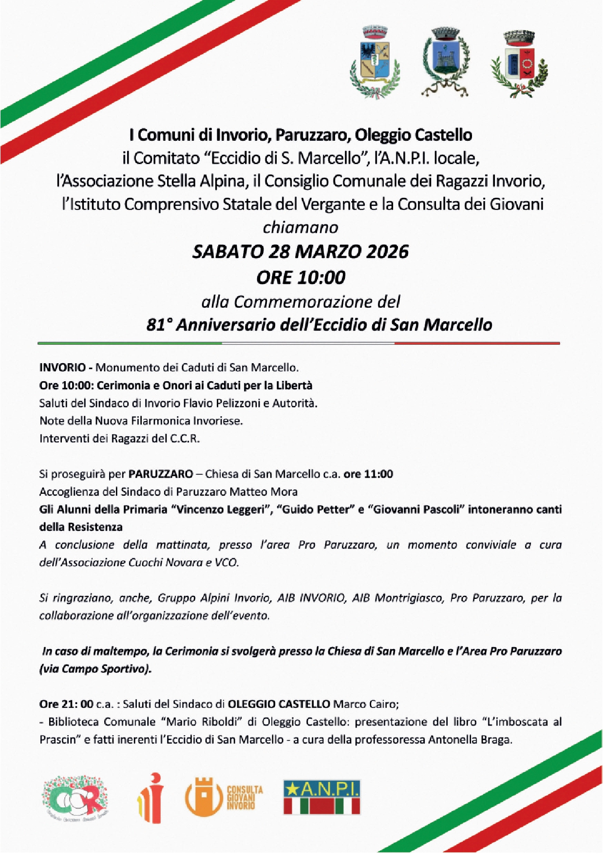 I Comuni di Invorio, Paruzzaro, Oleggio Castello, il Comitato "Eccidio di S. Marcello", l'A.N.P.I. locale, l'Associazione Stella Alpina, il Consiglio Comunale dei Ragazzi Invorio, l'Istituto Comprensivo Statale del Vergante e la Consulta dei Giovani chiamano