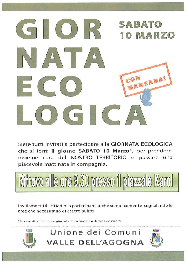 Tutti i cittadini sono invitati sabato 10 marzo alla giornata ecologica, organizzata dall'Unione dei Comuni Valle dell'Agogna, per prenderci cura insieme del nostro territorio e passare una piacevole mattinata in compagnia.