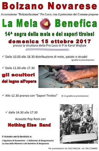 L'Associazione “Bolzano Insieme” Pro Loco, con il patrocinio del Comune di Bolzano Novarese propone la 14ma edizione de LA MELA BENEFICA, sagra della mela e dei sapori tirolesi.