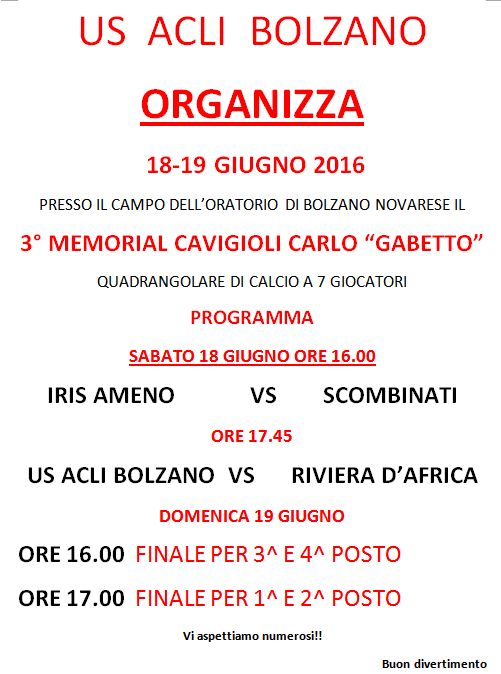 La US ACLI BOLZANO organizza il tradizionale quadrangolare di calcio presso il campo dell'oratorio di Bolzano Novarese.