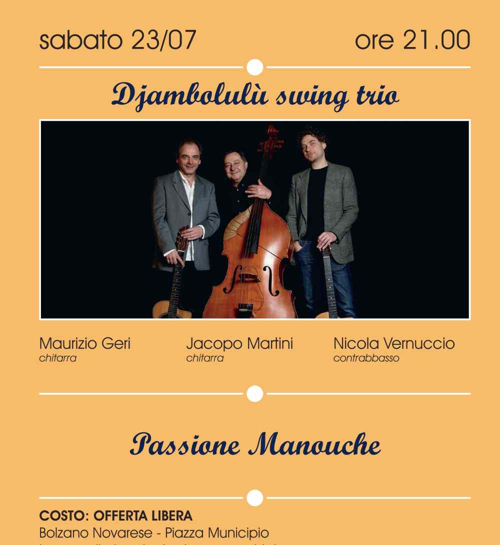 Si esibirà il Djambolulù swing trio: Maurizio Geri (chitarra), Jacopo Martini (chitarra), Nicola Vernuccio (contrabbasso)