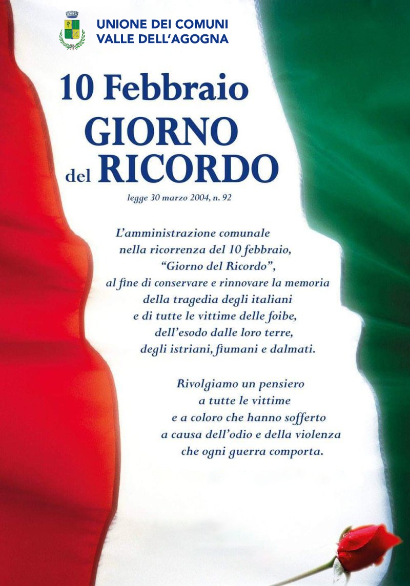 Oggi 10 febbraio, Giorno del Ricordo, l'Unione dei Comuni Valle dell'Agogna vuole rivolgere un pensiero alle vittime della tragedia delle foibe e dell'esodo degli istriani, dei fiumani e dei dalmati italiani costretti a fuggire dalle loro terre durante la Seconda Guerra Mondiale e nell'immediato dopoguerra