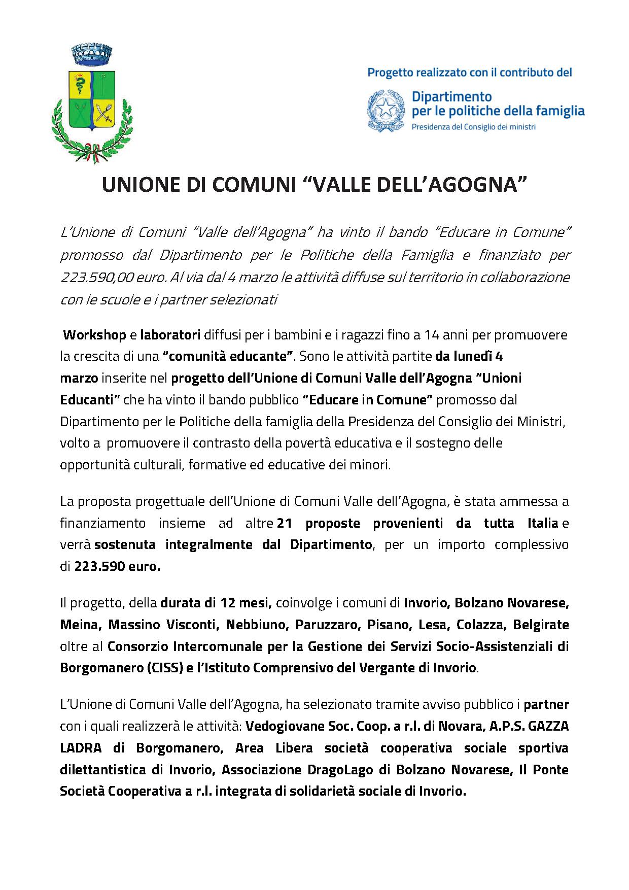 L’Unione di Comuni “Valle dell’Agogna” ha vinto il bando “Educare in Comune”